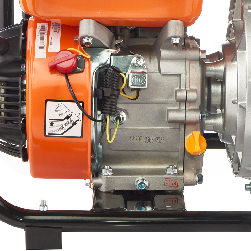 Высоконапорная, пожарная бензиновая мотопомпа. Тушение пожаров, перекачка воды на дальние растояние, полив. Мощность 5.4 лс, Производительность 25 куб м/час, напор 50 м, двигатель AP170F с датчиком масла в картере , D вх/вых 50/50-40-40 мм, размер частиц 1 мм, бак 3.6 л.