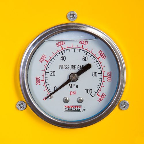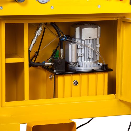 - Насосная станция соединена с прессами шлангами высокого давления через гидравлический переключатель. Перед началом работы переключатель устанавливается в положение, соответствующее выбранному прессу. При нажатии на педаль, электродвигатель приводит в действие насос, нагнетающий в систему рабочую жидкость и приводящий в действие соответствующий пресс;